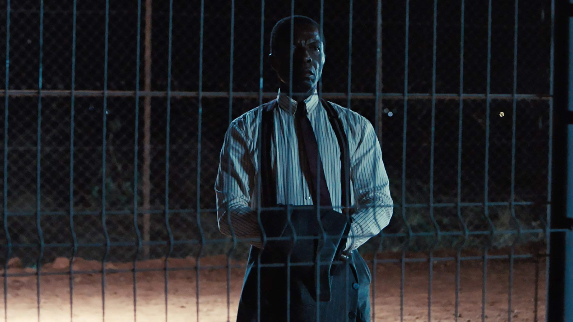 Pour rendre possible cette première adaptation cinématographique de Combat de nègre et de chiens, Claire Denis fait appel à l’ami qui la lie à Koltès, l’acteur Isaach de Bankolé, qu’elle avait dirigé dans Chocolat, S’en fout la mort et White Material, pour interpréter le personnage d’Aboury. Magistral et élégant comme toujours, il apparait en pleine nuit vêtu d’un costume, derrière les grilles qui protègent ce chantier d’Afrique de l’Ouest dirigé par Horn (Matt Dillon) pour récupérer le corps de son frère décédé sur le site. La quiétude du patron et du jeune ingénieur Cal (Tom Blyth) se trouve troublée par cet homme et par celle d’une jeune femme, Leone (Mia McKenna-Bruce), fraichement mariée à Horne et débarquée cette même nuit.